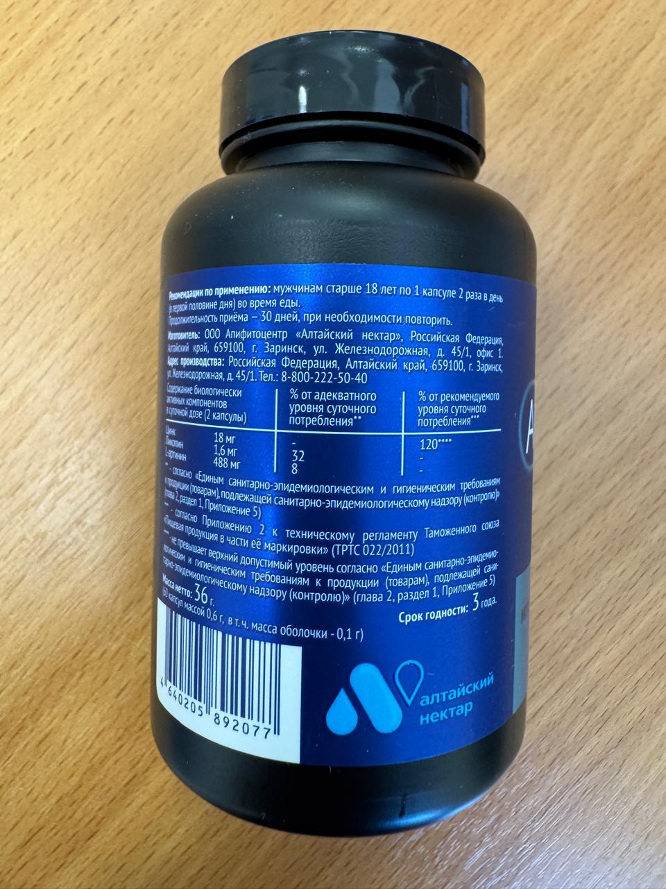 Активные компоненты: L-аргинин, мака перуанская, пажитник сенной (шамбала), плоды пальмы сабаль (сереноа), гинкго билоба, левзея сафлоровидная (маралий корень), цитрат цинка, ликопин, порошок пантов марала.